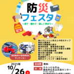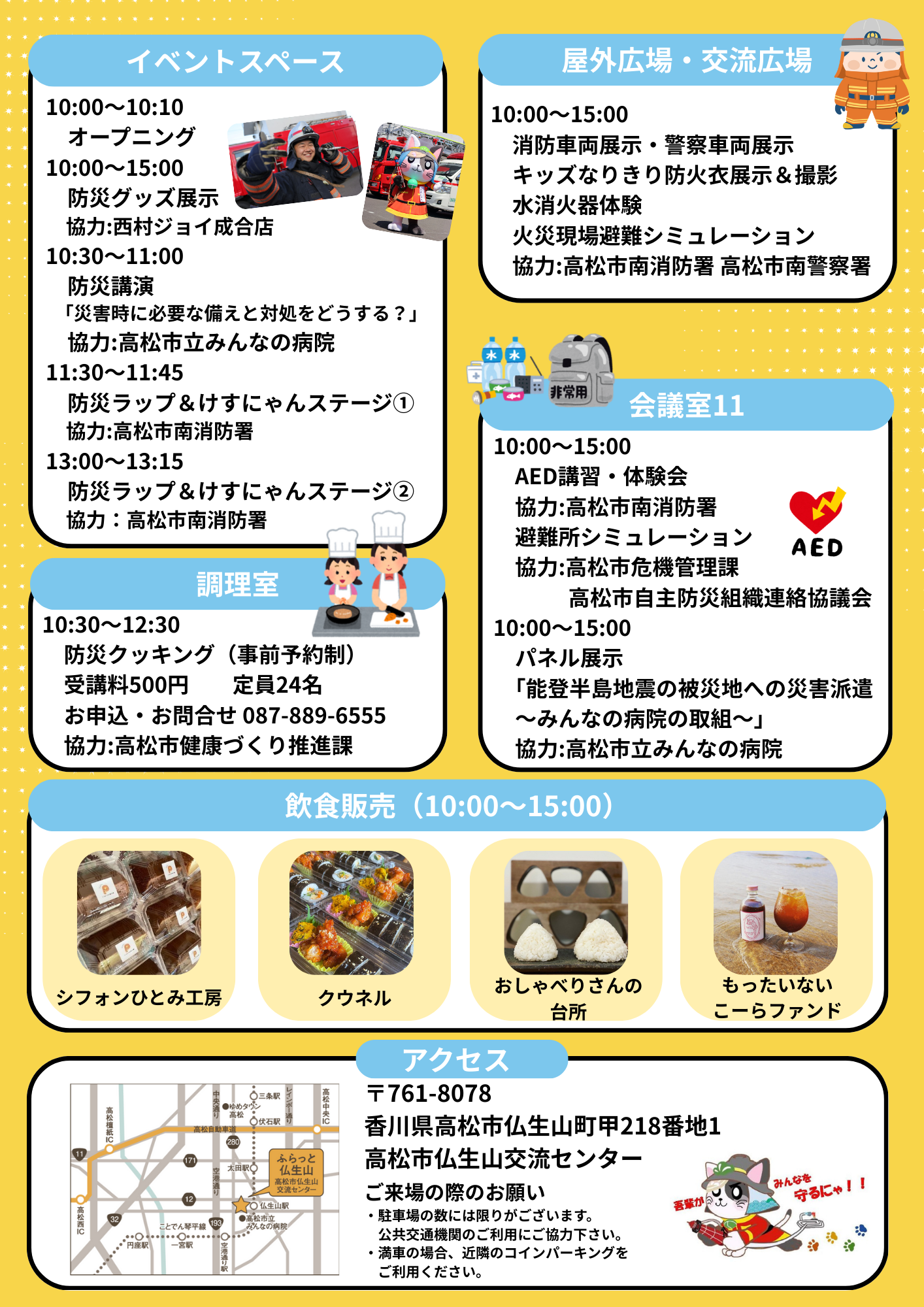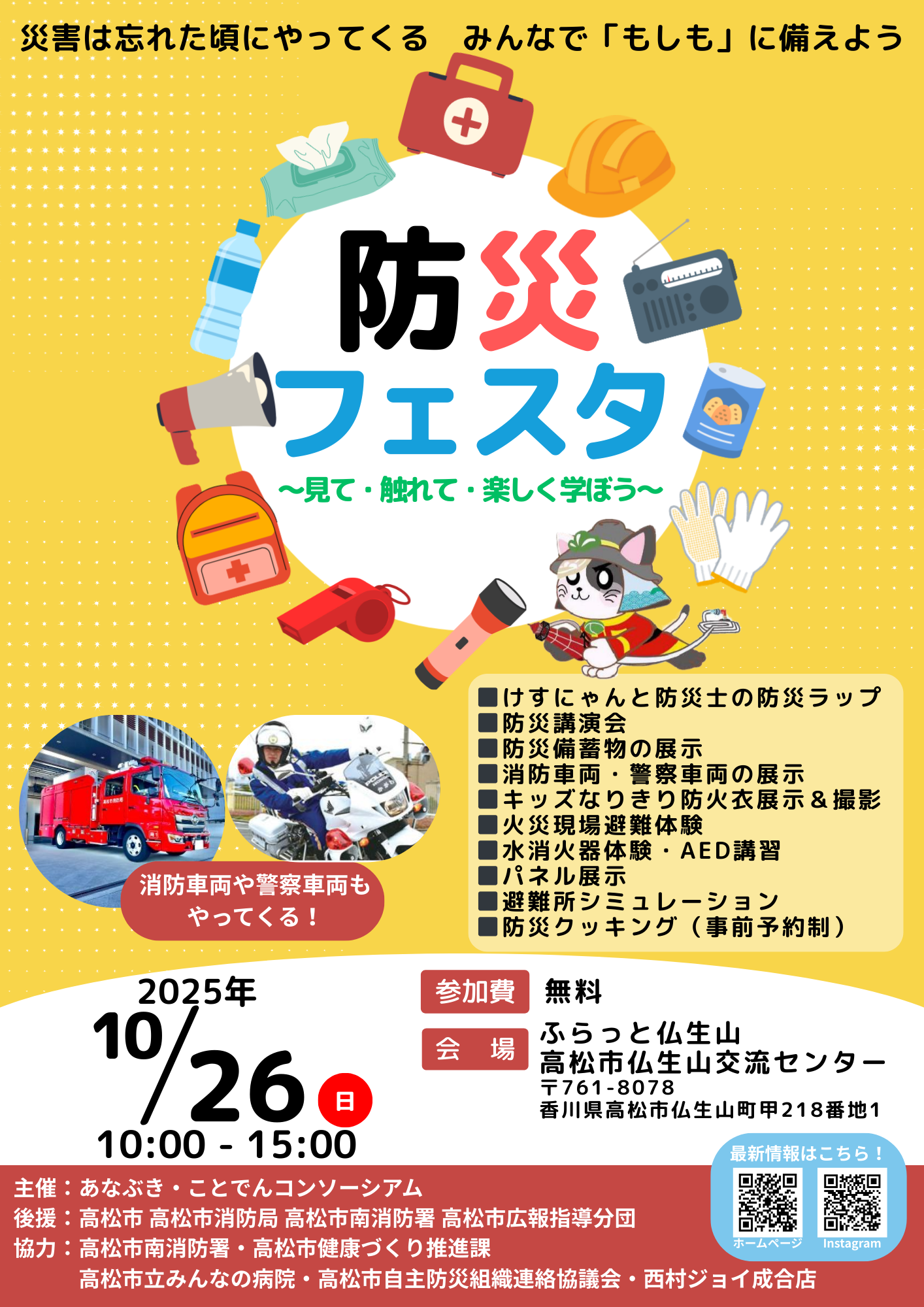 防災フェスタ~見て・触れて・楽しく学ぼう~ 2025年10月26日(日)に開催! 日時 :2025年10月26日(日) 開催時間:10:00~15:00 会場 :ふらっと仏生山高松市仏生山交流センター 催物 ・けすにゃんと防災士の防災ラップ ・防災講演会 ・防災備蓄物の展示 ・消防車両・警察車両の展示 ・キッズなりきり防火衣展示・撮影 ・火災現場避難体験 ・水消火器体験・AED講習 ・パネル展示 ・避難所シミュレーション ・飲食販売 ・防災クッキング(事前予約制) 実際に見たり、体験して防災を楽しく学びましょう! 皆様のご来館心よりお待ちしております。 ※消防の出動状況等により、一部イベント内容が変更になる可能性があります予めご了承くださいませ。