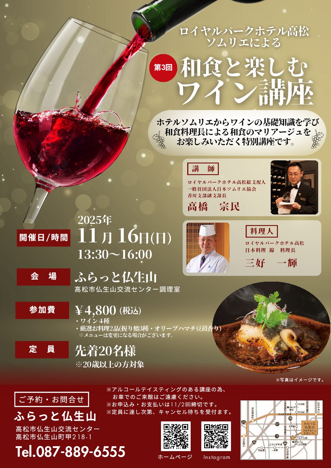 今年で3回目になるロイヤルパークホテル高松ソムリエによるワイン講座。今回は日本料理錦 和食料理長の厳選お料理2品と一緒にワインと和食のマリアージュをお楽しみいただきます。