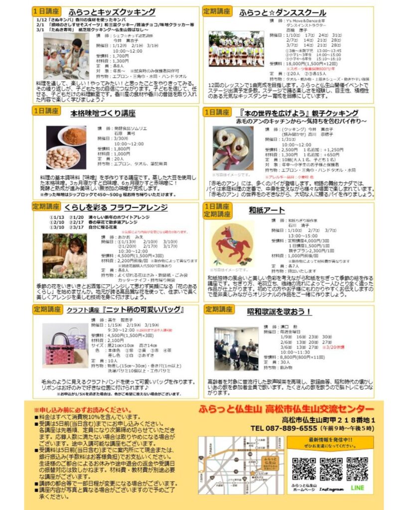 仏生山交流センターでは運動系のカルチャー、ものづくりのカルチャーや、料理…さまざまな講座をしています。気になる講座があれば遠慮なくお問い合わせください。