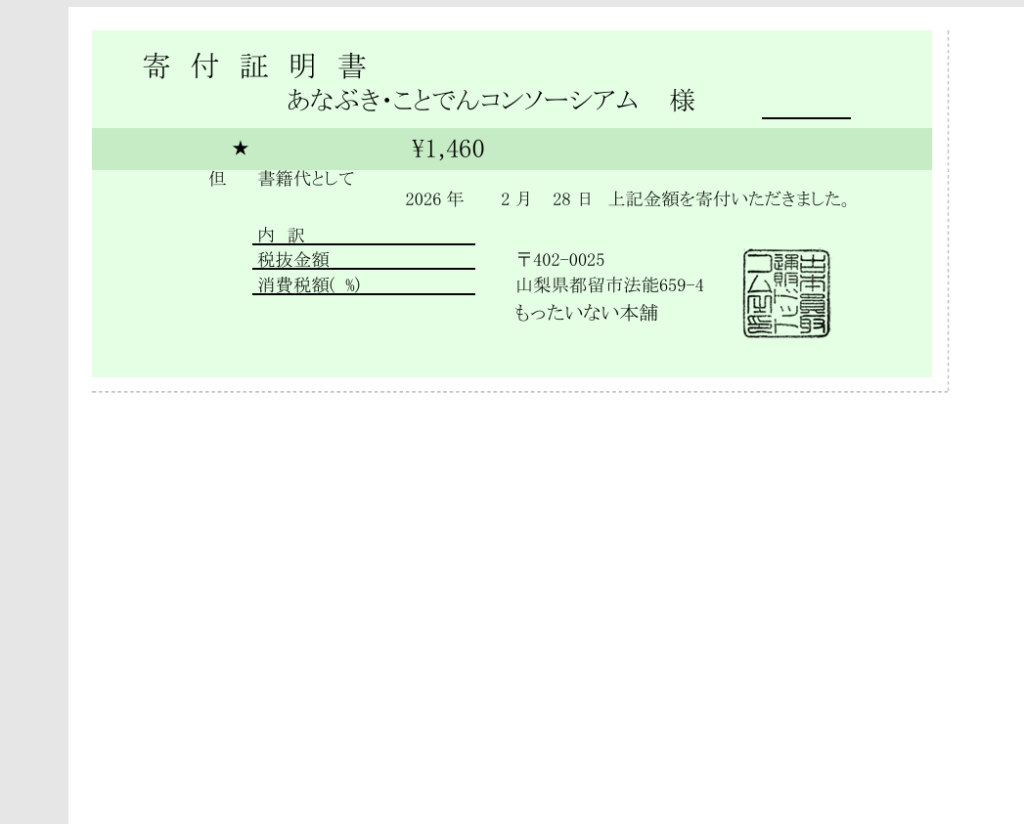 皆様から寄せられた313冊の本はもったない本舗様を通し、買取金額分1,460円を「植林活動グリーベルト運動」に全額寄付させていただきました。