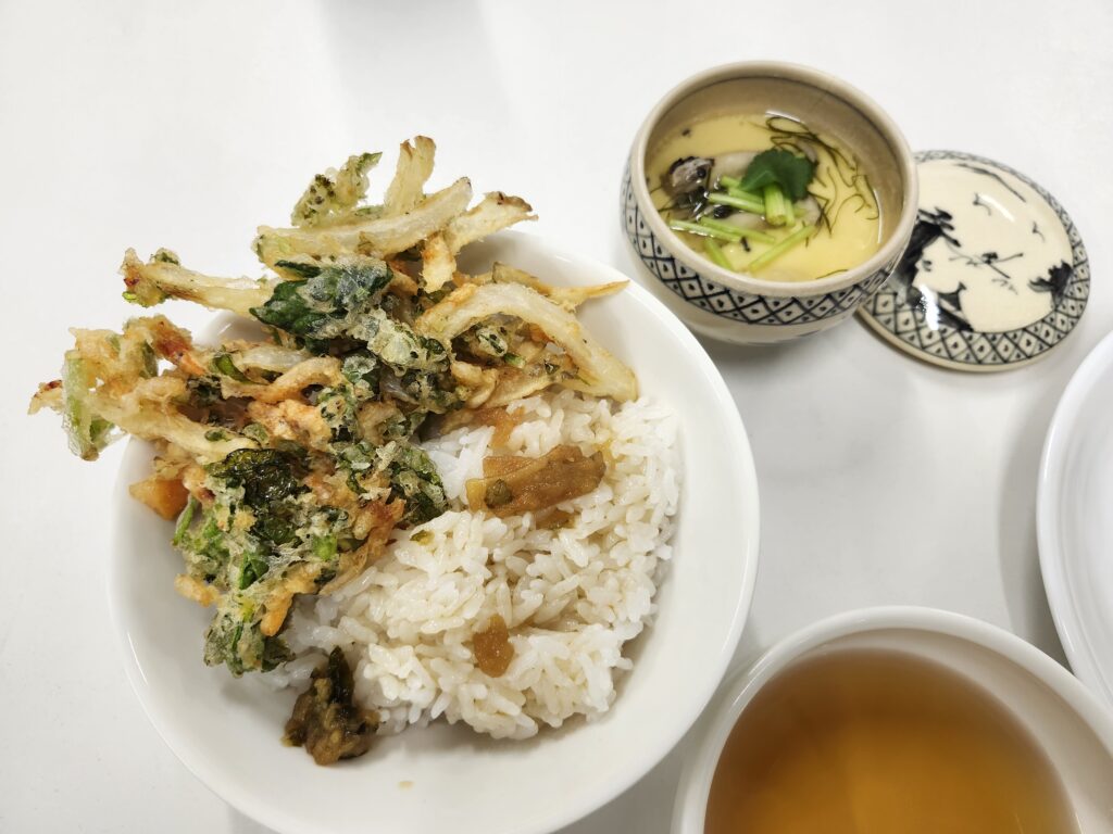 『天婦羅(かき揚げ)』と『白魚茶碗蒸し 桜葉餡かけ』